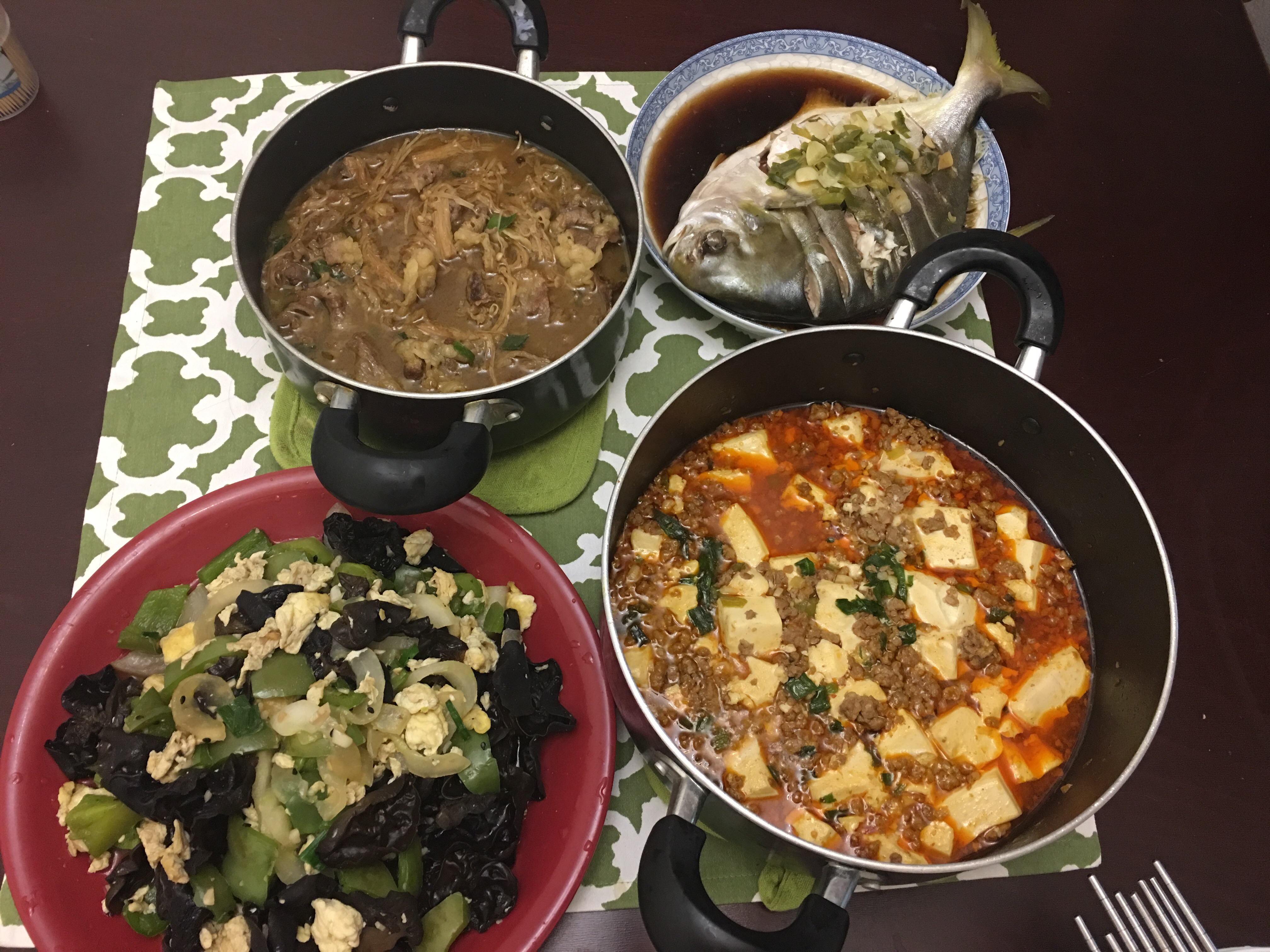 今天周日9/25/2016 中午叫了宇迪和dicky来吃饭,我做了四个菜,金针菇肥牛、木耳黄瓜炒鸡蛋、麻婆豆腐还有一个蒸鱼。